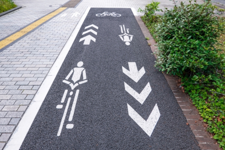 現在は車道のみの走行しか認められていない電動キックボードだが、23年7月1日からは自転車道や路側帯、また最高速度を6km/hまで落とすことで歩道での通行が可能になる。ただし、実際の道路標識や歩行者に十分注意をして運転することは、もちろん必要。周りをよく見て無理な運転はやめよう。