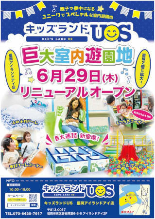 巨大室内遊園地の運営を行うユーエスマートは、室内遊び場「キッズランドUS 福岡アイランドアイ店」を6月29日にリニューアルオープンした。