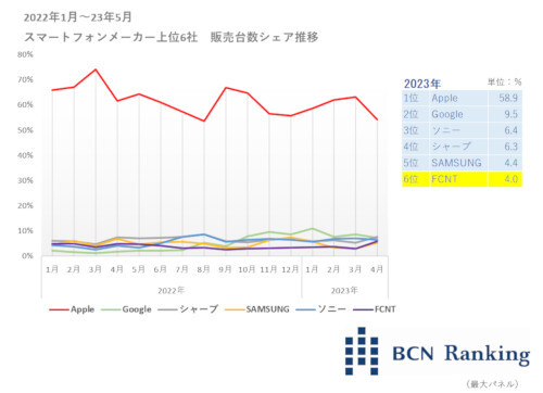 分かりにくいので「スマートフォン全体」として22年の年間メーカー別販売台数シェアを集計すると、1位はApple(58.9%)、2位はGoogle(9.5%)、3位はソニー(6.4%)。月ごとのシェアの推移をみると、2位グループと3位グループのそれぞれ数社で激しく争う状況だった。京セラはシェア3%未満の3位グループ、FCNTは2位グループに属し、23年5月の時点でも、FCNTはスマホ全体で6位、Androidに限ると5位という好位置につけていた。