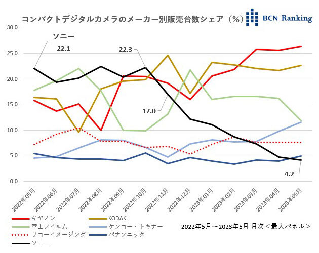 シェア急落が始まったのは昨年11月。前月の10月は22.3%でトップだったが、11月には17.0%と5.3ポイントも失い、一気に3位まで後退した。以降、毎月シェアを落とし続け、2月には8.8%と2桁割れ。それでもシェアの下落は止まらず、ついに5月には4.2%の7位までシェアを落とす結果になった。この間、わずか半年あまり。収益率の悪いコンパクトデジカメから撤退する前触れかとも思われた。しかし同社は6月23日、VLOGCAMのZV-1 IIを発売したばかり。当面撤退はなさそうだ。ただ、大幅なラインアップの整理が進んでいることもまた事実だ。