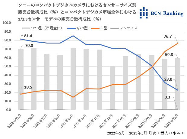 最も大きな変化はセンサーサイズの構成比に表れている。ソニーのコンパクトデジカメは、昨年5月の段階で1/2.3インチセンサー搭載モデルが販売台数の81.4%。比較的低価格なモデルが大半を占めていた。平均単価(税抜き、以下同)が1万5000円前後のCyber-shot W830を筆頭に、3万5000円前後のCyber-shot WX500などが売れ筋だった。しかし、この5月にはこれらの1/2.3インチのセンサー搭載モデルは23.0%まで縮小。逆に平均単価8万6000円前後のVLOGCAM ZV-1や同15万5000円前後のCyber-shot RX100 VIIなど、比較的高価な1インチセンサー搭載モデルが76.5%を占めるまでに拡大した。