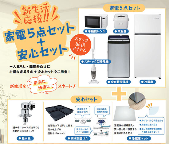 「新生活応援!家電セット」では、新たに一人暮らしを始める学生や社会人、転勤者が、よりお得で快適な新生活をスムーズにスタートするための家電必需品5点セットとして、冷蔵庫(120-150L)、全自動洗濯機(4.5-5.5L)、スティック型掃除機、単機能レンジ(15-20L)、炊飯器(3-4合)を同社スタッフが厳選し、用意した。また、より安心して生活できるよう、給水栓や高さ調整ゴム、冷蔵庫マットの便利ツールも付帯した。給水栓は、通水中にホースが抜けても自動的に水をストップする。高さ調整ゴムは、洗濯機の下(脚)に敷き、 高さを上げる便利なゴムマット。静音・振動軽減・掃除スペース確保に役立つ。冷蔵庫マットは、冷蔵庫の新規購入・買い替え時に設置。床面の凹みを防止する。