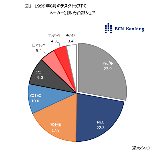 99年8月のデスクトップ市場において、首位を獲ったメーカーはアップルでシェアは27.9%。以下、NECが22.3%、富士通が17.9%、SOTECが10.0%。ソニーは9.0%、日本IBMは5.2%、コンパックは4.3%と続く。現在でもランキングデータに登場するメーカーはアップル、NEC、富士通のみ。他のメーカーの行く末を簡単に紹介すると、SOTECが99年12月にキョウデンと資本・業務提携、ソニーは14年にVAIOに移管、日本IBMは05年にPC部門をLenovoへ買収、コンパックは02年、HPに吸収合併されるなど、いろいろなことが起こった。