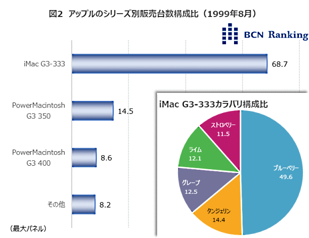 メーカーシェアトップのアップルをけん引していたのは、「iMac G3-333」だ。iMac G3は98年8月に日本で発売、以後スペックをアップグレードしながら次々と製品を発売していった。iMac G3-333が99年4月に発売となり、アップルのシェアをけん引。同社のうちほぼ7割を占めている。iMacは多色展開しており、カラーバリエーションの構成比は、ブルーベリーが49.6%、タンジェリン(14.4%)、グレープ(12.5%)、ライム(12.1%)、ストロベリー(11.5%)だった。