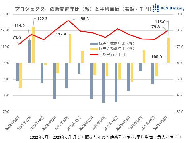 プロジェクター市場はこの6月、販売台数は前年比で100.0%にとどまったものの、販売金額は115.6%と2桁増を記録した。この1年、単価の上昇とともに販売金額こそ2桁増を記録する月はあったが、販売台数が伸び悩んでいた。台数、金額とも100%台に戻したのは昨年7月以来1年ぶりだ。4K対応モデルの構成比が14%程度まで上昇していることもあって、平均単価(税抜き、以下同)も7万9800円と、8万円付近で推移している。