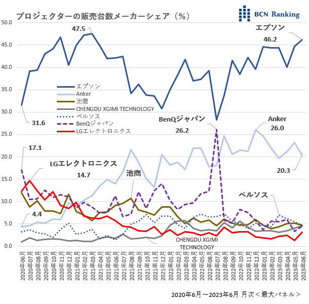メーカーシェアも2位以降で動きがあった。2020年6月時点では、トップは31.6%でエプソン。2位はBenQジャパンで17.1%、3位がLGエレクトロニクスで12.3%だった。この6月のシェアでは、トップは変わらずエプソンで46.2%。2位には20.3%でAnkerがつけた。他社にはないユニークな製品を武器に3年前のシェア4.4%で5位からの大躍進だ。3位以下のメーカーは、すべて5%未満のシェアに落ち込んでいる。3年の間にエプソンとAnkerの寡占が進んだ。