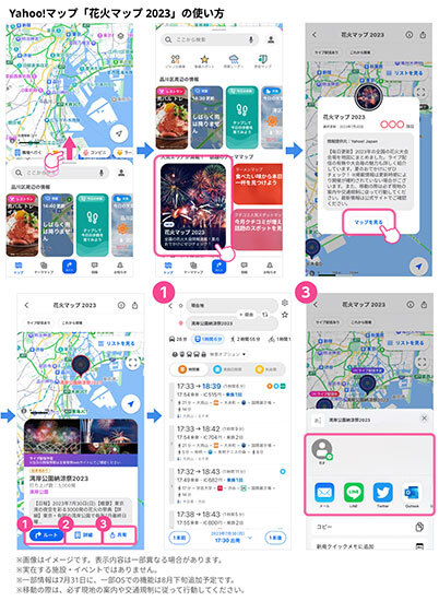 Yahoo!マップ(iOS版、Android版)では、全国約450カ所の花火大会の開催スポットが地図上で確認できる「花火マップ 2023」の提供を開始。地図上から花火大会の開催スポットの写真・施設名・イベント名・開催日程・概要・詳細などが確認できるほか、ユーザーから要望の多かった花火の打ち上げ数や打ち上げ時間、昨年の人出も確認できる。