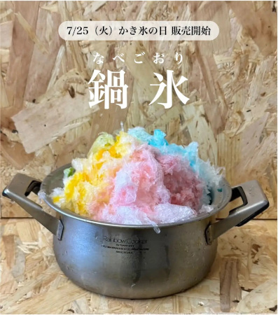 鍋氷では、かき氷を入れて欲しい鍋を持参すれば、鍋いっぱいのかき氷の上に選んだシロップをかけて提供。シロップの種類は、「あまおういちご」「特選抹茶」「完熟マンゴー」「完熟桃」「完熟ぶどう」「スーパーブルーハワイ」「クラフトコーラ」などで、全シロップの中から希望のものをいくつでも選択できる。また、「練乳」「白玉」「あずき」「チョコ」「ラムネ」などのトッピング(追加料金あり)も用意している。