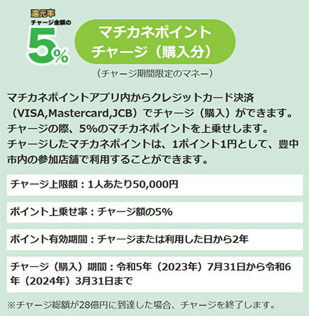 マチカネポイントアプリへのチャージ期間は7月31日~2024年3月31日だが、チャージ総額が28億円に達し次第終了する。チャージ上限は1人あたり5万円で、1セット1000円単位でクレジットカード(VISA、Mastercard、JCB)によるチャージが可能。12月からはセブン銀行ATMからの現金によるチャージの開始も予定している。
