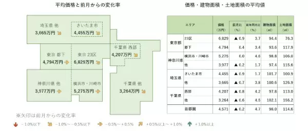 埼玉県他の平均価格は3665万円で前月比マイナス0.7%と4カ月ぶりに下落した。一方、前年同月比はプラス3.8%と上昇し、前年同月超えが38カ月連続となっている。