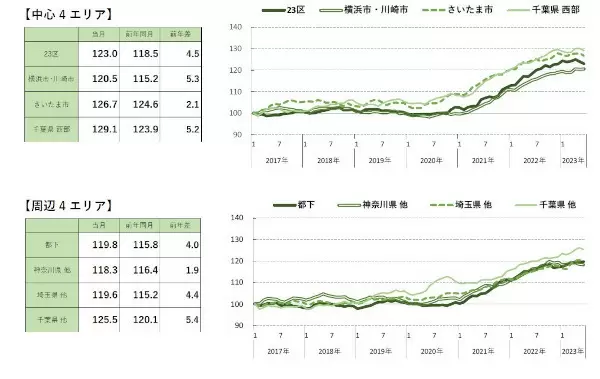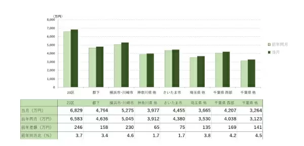 東京都(23区/都下)、神奈川県(横浜市・川崎市/他)、埼玉県(さいたま市/他)、千葉県(西部/他)の首都圏8エリアにおける新築戸建の平均価格は4571万円で、前月比マイナス0.2%と2カ月連続で下落した。一方、平均価格の前年同月比は、20カ月連続して全エリアで前年同月を上回った。ただ、上昇率は全てのエリアで5%未満にとどまり、5%超が5エリアあった前月に比べ上昇の勢いに弱まりが見られた。なお、東京都下は2017年1月以降最高額を更新した。