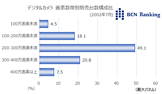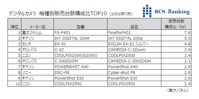 今回は2002年7月のデジタルカメラ市場のデータを紹介。当時BCNが収集したデータを使い、メーカーシェア、機種別の順位、画素数帯別販売台数構成比をみていく。なお、当時はコンパクトと一眼の区別をしていなかったので、デジタルカメラ全体の集計となっている。