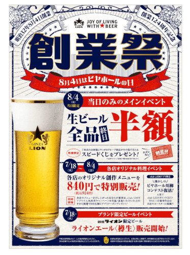 8月4日限定の「創業祭」では全国のサッポロライオンチェーンの開店から閉店まで、取り扱いのある生ビール全品を終日半額で提供する。