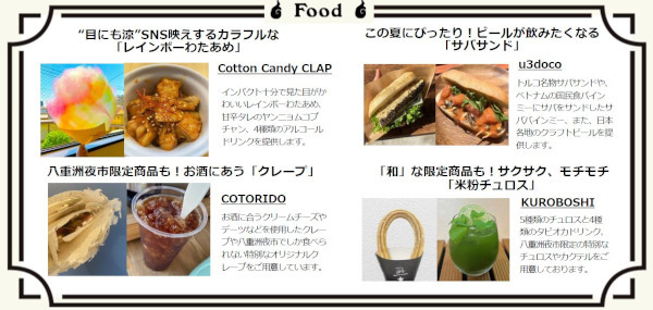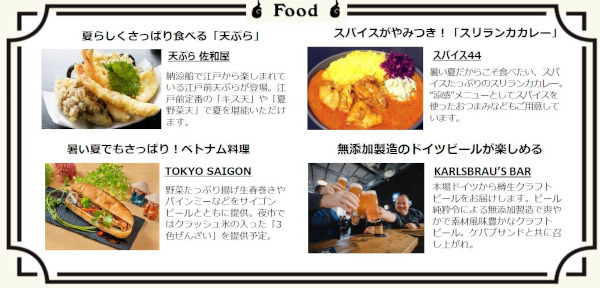 八重洲夜市では、古くから愛される江戸前てんぷらやスパイスたっぷりのスリランカカレー、トルコの定番料理サバサンドといった、暑い夏を乗り切るこだわりのフードやクラフトビールを週替わりで楽しめる。また、カラフルなわたあめやフルーツを使った涼やかなスイーツなど、お祭り感あふれるメニューも充実している。
