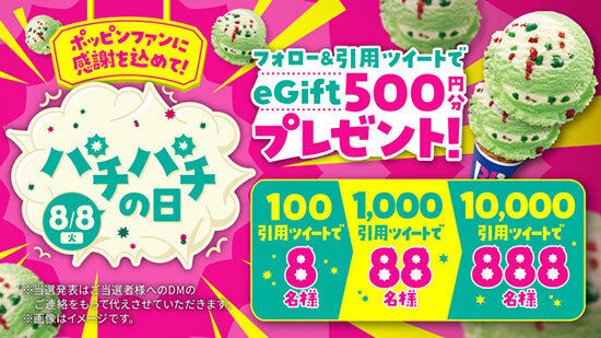 B-R サーティワン アイスクリームは、人気フレーバー「ポッピングシャワー」のパチパチ弾けるポップロックキャンディにかけて8月8日「パチパチの日」に制定し、ポッピングシャワー好きに向けたキャンペーンを開催している。