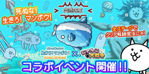 ポノスのスマホ向けゲームアプリ「にゃんこ大戦争」において、SELECT BUTTONのスマホ向けゲームアプリ「生きろ!マンボウ!」とのコラボイベントが8月18日から実施されている。期間限定で、開催期間は9月1日10時59分まで。