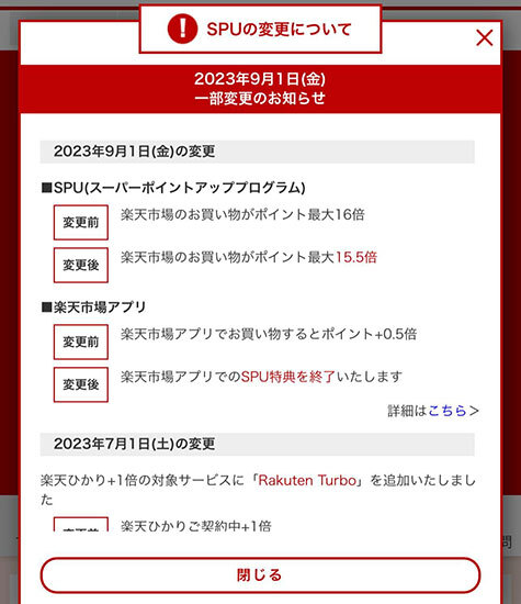 8月31日をもって楽天市場公式スマートフォンアプリからの買い物を対象とした現行の「楽天市場アプリでお買い物するとポイント+0.5倍」(最大獲得ポイント1万5000)は終了。SPU最大倍率は現行の「ポイント最大16倍」から「ポイント最大15.5倍」に変わる。これまで楽天市場アプリを利用していた人にとっては改悪、利用していない人にとっては変更はない。