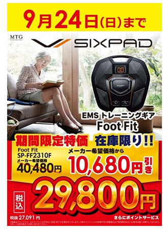 ビックカメラグループは8月26日~9月24日の期間限定で、足を乗せることによって歩くときに使う筋肉が鍛えられる「SIXPAD Foot Fit(シックスパッド フットフィット)」をSIXPAD取り扱い店舗とECサイトで4万480円の価格から1万680円引きの2万9800円で販売する。なお、ECサイトでは8月25日20時から先行販売する。