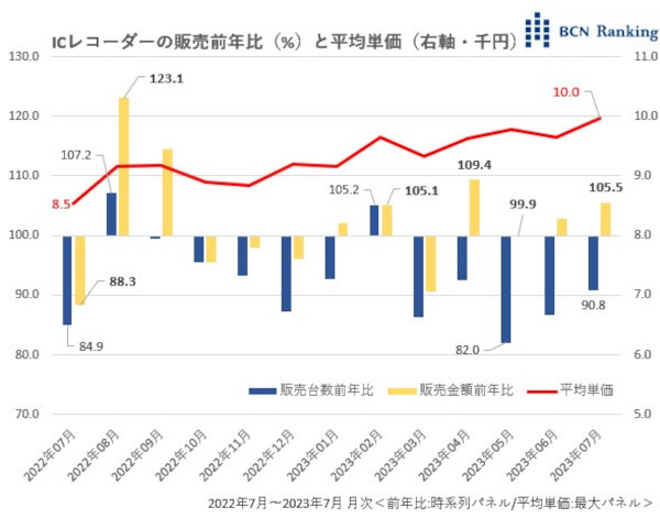 単価上昇のきっかけはソニーの値上げだ。昨年9月、ICレコーダー8機種を値上げ。さらにこの2月、前回の7機種を含む8機種を値上げした。しかし2回とも、値上げ実施後は平均単価が維持できず、ダラダラと下がる傾向が続いている。その結果、昨年7月とこの7月を比較した平均単価の上昇率は10.4%にとどまった。一方OMDS製品は、ジリジリと単価が上昇。昨年7月の6600円から、この7月には8500円と28.4%も上昇した。このため、市場全体の平均単価も1年で16.8%の上昇を果たした。