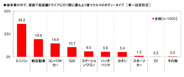 調査対象者に、保有車のボディータイプをたずねたところ(複数回答)、「軽自動車」(41.5%)がもっとも多く、「ミニバン」(38.1%)、「コンパクトカー」(19.9%)、「SUV」(13.2%)、「ハッチバック」(7.3%)と続いた。保有車の中で、家族で長距離ドライブに行く際にもっともよく使うクルマのボディータイプは、「ミニバン」(36.2%)が最多となり、以下「軽自動車」(19.4%)、「コンパクトカー」(14.8%)、「SUV」(10.7%)、「ステーションワゴン」(6.0%)が続いている。
