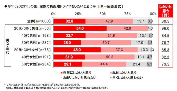 今年の夏に、家族で長距離ドライブをしたいと思うかたずねた質問では、「非常にしたいと思う」(32.6%)と「まあしたいと思う」(47.9%)を合わせた割合が80.5%に達した。性年代別では、家族で長距離ドライブをしたいと思う割合が、男女とも若い年代ほど高くなる傾向がみられる。また過去の調査との比較では、家族で長距離ドライブをしたいと思う割合が3年連続で上昇している。