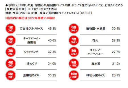 さらに、2023年の夏に、家族で長距離ドライブをしたいと思うと回答した人(805人)に、家族との長距離ドライブの際にドライブ先で行いたいこと・行きたいところをたずねたところ(複数回答)、「ご当地グルメめぐり」(45.3%)、「テーマパーク・遊園地」(40.6%)、「ショッピング」(37.3%)、「湯めぐり」(34.0%)、「景勝地めぐり」(33.2%)が上位を占めた。