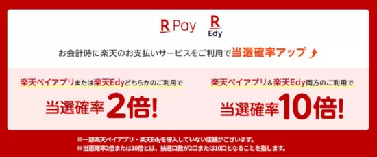 さらに、期間中に対象店舗で「楽天ペイ」アプリのコード・QR・セルフ払いまたは「楽天Edy」で支払いをすると当選確率が2倍に、両方を利用すると10倍となる。