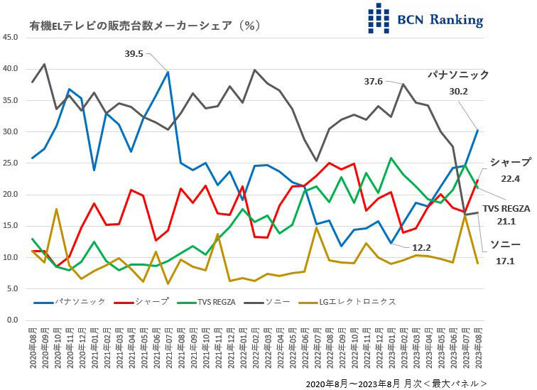 有機ELテレビでこの8月、パナソニックが販売台数シェア30.2%を記録。2年ぶりに首位を奪還した。2位シャープと7.8ポイント差をつけて頭一つ抜け出した格好だ。7月にはTVS REGZAと僅差で2位にとどまったが、競合を突き放してトップシェアを獲得した。全国の家電量販店やオンラインショップの実売データを集計するBCNランキングで明らかになった。