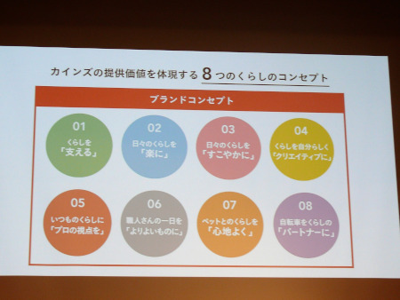 新たなプロダクトブランドは(1)「くらしを『支える』」がコンセプトの「CAINZ」、(2)「日々のくらしを『楽に』」がコンセプトの「CAINZ STYLE」、(3)「日々のくらしを『すこやかに』」がコンセプトの「CAINZ FIT」、(4)「くらしを自分らしく『クリエイティブに』」がコンセプトの「CAINZ MAKE」、(5)「いつものくらしに『プロの視点を』」がコンセプトの「CAINZ IZM」、(6)「職人さんの一日を『よりよいものに』」がコンセプトの「CAINZ PRO」、(7)「“うちの子”とのくらしを『心地よく』」がコンセプトの「CAINZ PET」、(8)「自転車をくらしの『パートナーに』」がコンセプトの「CAINZ CYCLE」――の八つ。カインズの提供価値を表現したものという。