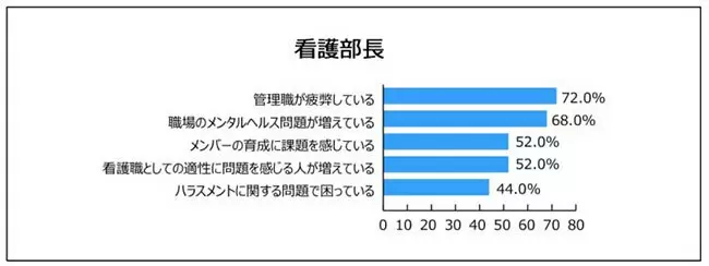 看護職員を取りまとめる、副看護部長や看護師長といった中間管理職では、「職場のメンタルヘルス問題が増えている」「メンバーの育成に課題を感じている」といった回答が最多となっている。