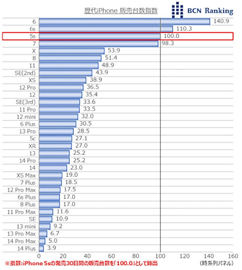 家電量販店・ネットショップの実売データを集計する「BCNランキング」を使い、歴代iPhoneにおける発売から30日間の販売台数指数を算出した。3大キャリアから発売となったiPhone 5s以降を対象にすると、最も売れたのはiPhone 6だった。