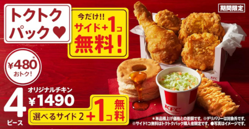 日本ケンタッキー・フライド・チキン(KFC)は、全国の店舗で「秋のトクトクパックサイド1個無料」キャンペーンを9月27日から10月24日までの期間限定で実施する。