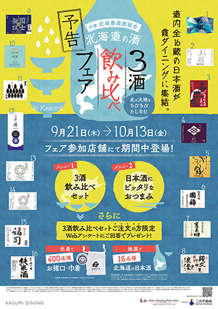 北海道酒造組合は、飲み比べイベント「北海道の酒3酒飲み比べフェア」を、9月21日から10月13日まで東京都千代田区の「霞ダイニング」で開催する。