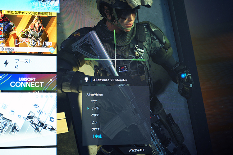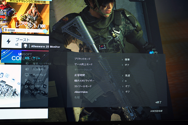ゲームはAW2524HFと同じく、レインボーシックス シージのPS5版をプレイ。PS5を起動させると、まず画像の美しさに驚いた。キャラクターのまつげ1本1本まで見える、きめ細やかさがある。細部の色彩も色鮮やかで、まるで映画を見ているようだった。