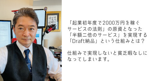 「2倍の機能を半額で提供するサービス」を自分が実施するために作った仕組みは、(1)Draft納品という仕組み、(2)議事録の廃止、(3)電子メールの廃止、(4)社内コミュニケーションの廃止、(5)業務のレシピ化と作業単価給の採用、(6)オフィスは持たない、移動もしない、(7)最終奥義:営業をしなくて済むモデルにする――の七つです。この中で特に大きな差別化になったのは、1と5と7です。これから数回にわたって紹介します。今回は、「Draft納品という仕組み」を説明します。Draft納品という仕組み