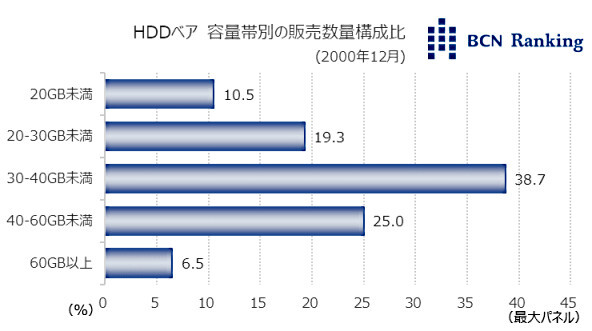 今回は2000年12月のHDDベア市場を取り上げる。当時、BCNが収集していたデータによると、メーカーシェアでは日本IBMが6割を占め、2位のMaxtorと40ポイント以上の差をつけ首位を独走。容量帯は30-40GB未満の構成比が4割近く、ボリュームゾーンだった。