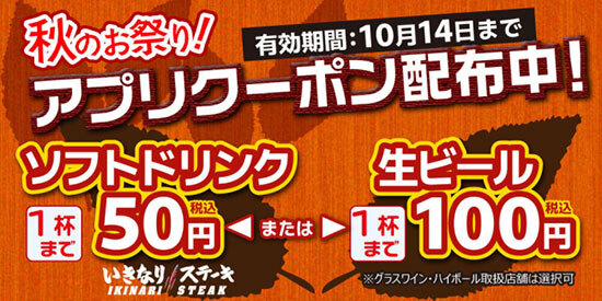 ペッパーフードサービスは10月8~14日の間、「いきなり!ステーキ」公式アプリの会員向けに生ビール1杯まで100円(ハイボールやグラスワインも可)もしくはソフトドリンク1杯まで50円(トクホ黒烏龍茶やレッドブルも可)になるアプリクーポンを配布する。