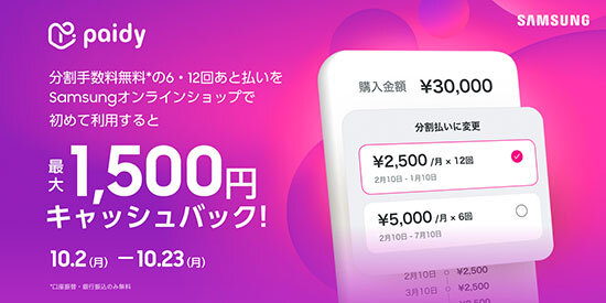 サムスン電子ジャパンは10月2日~23日23時50分の期間、「Samsungオンラインショップ」でPaidyの運営するあと払い(BNPL)サービス「ペイディ」を利用することで、最大1500円がキャッシュバックされるキャンペーンに参加する。