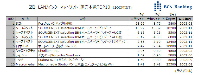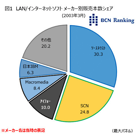 今回は2003年3月のLANインターネットソフト市場を取り上げる。当時、BCNが収集していたデータによると、メーカー別販売本数シェアはソースネクストが3割を占めて首位、2位はSCN(ソニーコミュニケーションネットワーク)だった。ちなみにこのLANインターネットソフト市場は、メールソフトやブラウザなどネットワークやインターネットに関連するソフト全般を集計している。