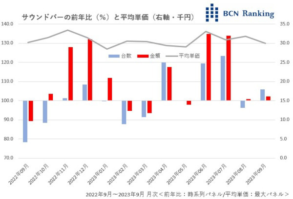 テレビの音をリッチにするサウンドバーの販売が好調だ。若干の浮き沈みはあるものの、特に春以降伸びている。平均単価の上昇もあり、販売金額の伸びが目立つ。一方テレビ市場は、コロナ禍で生じた巣ごもり特需の反動減に苦しんでいる。ようやく出口が見えてきた感があるものの、販売は依然として前年割れ。こうした環境下でもサウンドバーは売れている。全国2300店舗の家電量販店やオンラインショップの実売データを集計する、BCNランキングで明らかになった。
