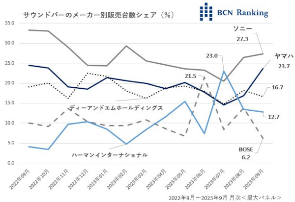 メーカー別の販売台数シェアでは、安定的に強いのがソニーだ。昨年からはややシェアを落としているものの、25%前後で推移している。この9月の販売台数シェアは27.3%でトップだった。売れ筋は平均単価(税抜き、以下同)が1万円を切る9400円と破格のHT-S100Fだ。サウンドバー全体で9月の平均単価はちょうど3万円。いかに安いかが分かる。低価格ながら基本的機能は備えており人気化した。同社の製品では、ミドルクラスのHT-X8500も売れている。立体的な音響で臨場感ある音を楽しめる製品ながら、平均単価3万400円と全体の単価と同水準の製品だ。