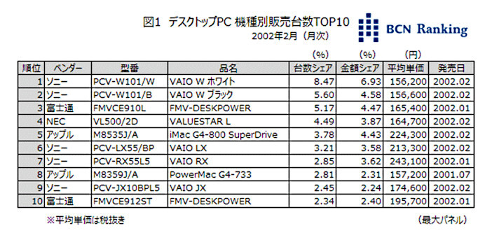 <懐かしのデジタル家電> 2002年2月のデスクトップPC市場、VAIO Wが発売早々に上位独占