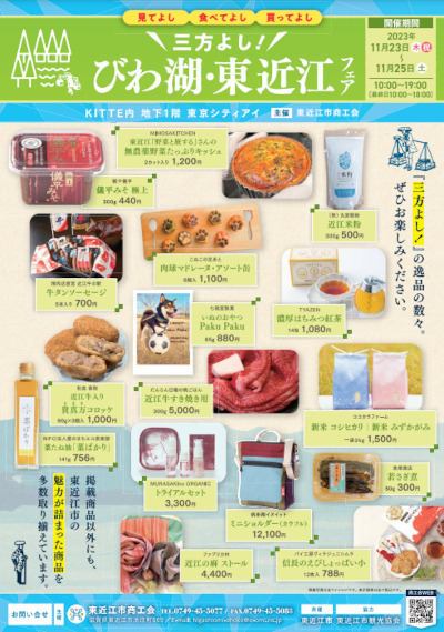 東近江市商工会は、東京駅前で物産展「『見てよし、食べてよし、買ってよし』三方よし!びわ湖・東近江フェア」を11月23日から25日までの3日間にわたって開催する。