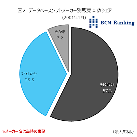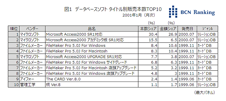 今回は2001年1月のデータベースソフト(DB)市場を取り上げる。当時、BCNが収集していたデータによると、マイクロソフト「MS Access」をはじめファイルメーカー「FileMaker Pro」、アイフォー「The Card」、管理工学「桐」がランランキングの上位に入った。