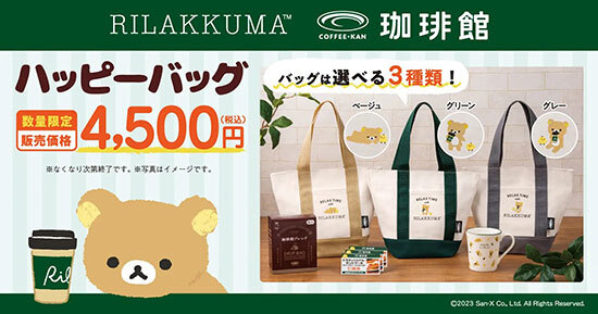 C-Unitedは、「珈琲館」「珈琲館 蔵」「CAFE DI ESPRESSO珈琲館」で「リラックマ」と初コラボを実施し、リラックマのオリジナルグッズやドリップバッグ、トラディショナル・ホットケーキ引換券など、四つのアイテムが入った期間限定のオリジナルハッピーバッグを12月15日から数量限定で発売する。価格は4500円。