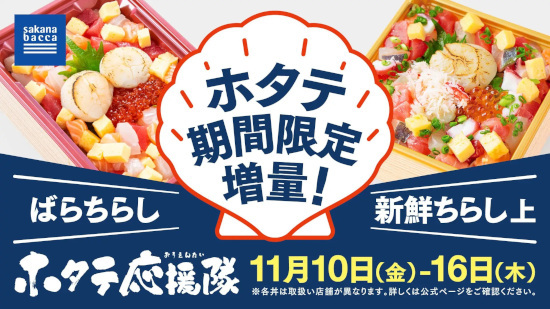 フェアでは、人気商品の「ばらちらし」(価格は1380円)と「新鮮ちらし上」(同980円)にホタテ1個を増量して価格を据え置く。また、殻付きホタテ、刺身用むきホタテ、海鮮丼、お造り、寿司など、ホタテ応援シールを貼った対象商品の購入でペットボトルウォーターをプレゼントする。