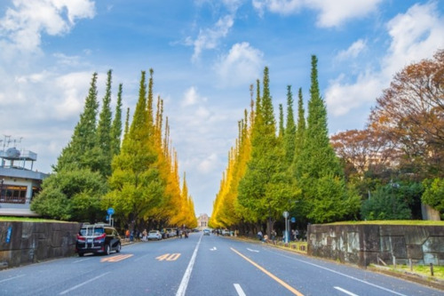 明治神宮外苑のいちょう並木は、映画やドラマのワンシーンにもよく登場する名所だ。東京の青山通りから聖徳記念絵画館へ向かって続く約300mの道には、146本のいちょうが植えられている。11月下旬頃に見頃を迎え、黄金色に染まる紅葉を見上げながらの散歩は、圧巻だ。おすすめは、「聖徳記念絵画館」の正面階段上から眺めるいちょう並木。樹高順に青山口から下り傾斜にしたがって植えられているため、奥行きの広がったいちょう並木が眺められ、スケールの大きさと立体感とを実感できるだろう。