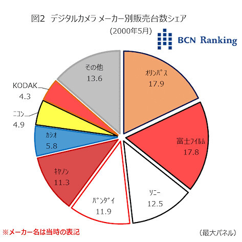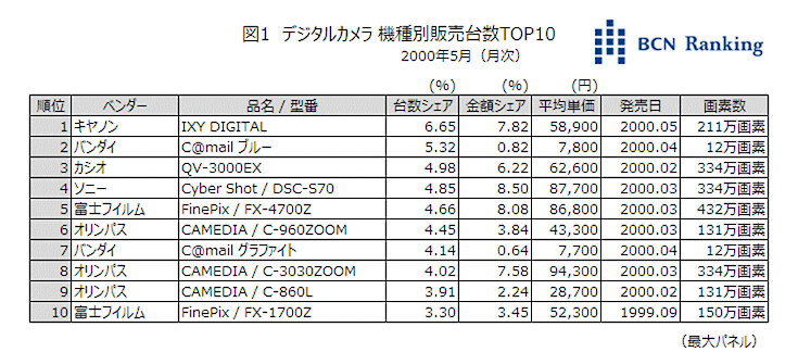 今回は2000年5月のデジタルカメラ市場を取り上げる。当時、BCNが収集していたデータによると、機種別で「IXY DIGITAL」が発売当月で首位を獲得。また、メーカー別の販売台数シェアでは、オリンパスが首位、0.1ポイント差で富士フイルムが追う形だった。