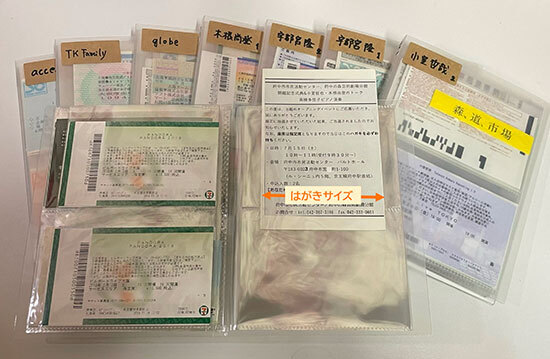 と、その前に、まずチケットのサイズを確認しておきましょう。主催者や各コンビニ経由で発券されているチケットのサイズは、縦61~76mm、横120~128mm。もちろん例外もありますが、基本的にはこのサイズに収まることが「チケット収納ファイル」に求められる必要最低条件となります。
