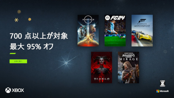 今回のセールでは、Xboxのタイトル700点以上が対象で、最大95%オフのタイトルもある。今年の秋に発売したばかりの最新作「Starfield」や「Forza Motorsport」、「アサシン クリード ミラージュ」、「サイバーパンク2077:仮初めの自由」などもセール対象となっている。セール対象の注目タイトルでは、「Starfield」(7760円、20%オフ)、「Forza Motorsport Premium Edition」(1万1682円、10%オフ)、「EA SPORTS FC 24 Standard Edition」(4850円、50%オフ)、「Hi-Fi Rush」(3112円、25%オフ)、「PAYDAY 3」(4928円、20%オフ)、「Redfall」(2425円、75%オフ)、「Street Fighter 6 デラックスエディション」(7867円、25%オフ)、「ディアブロ IV – スタンダードエディション」(5880円、40%オフ)。